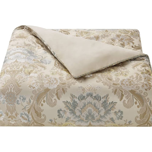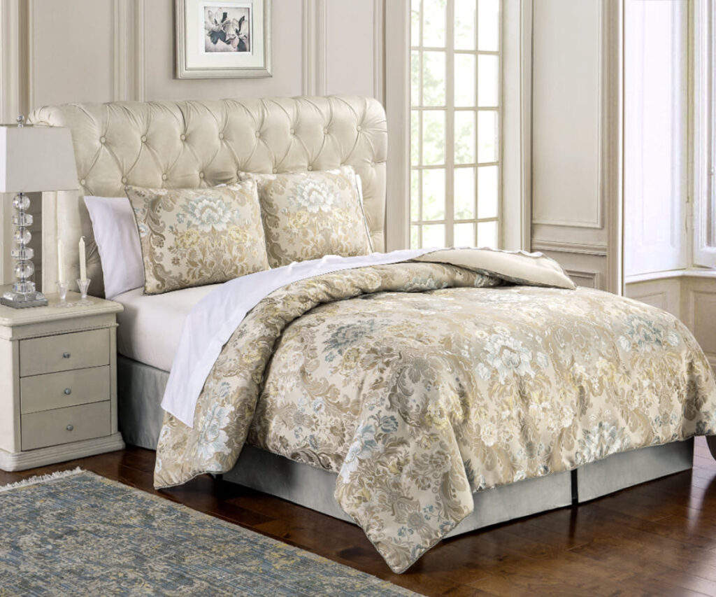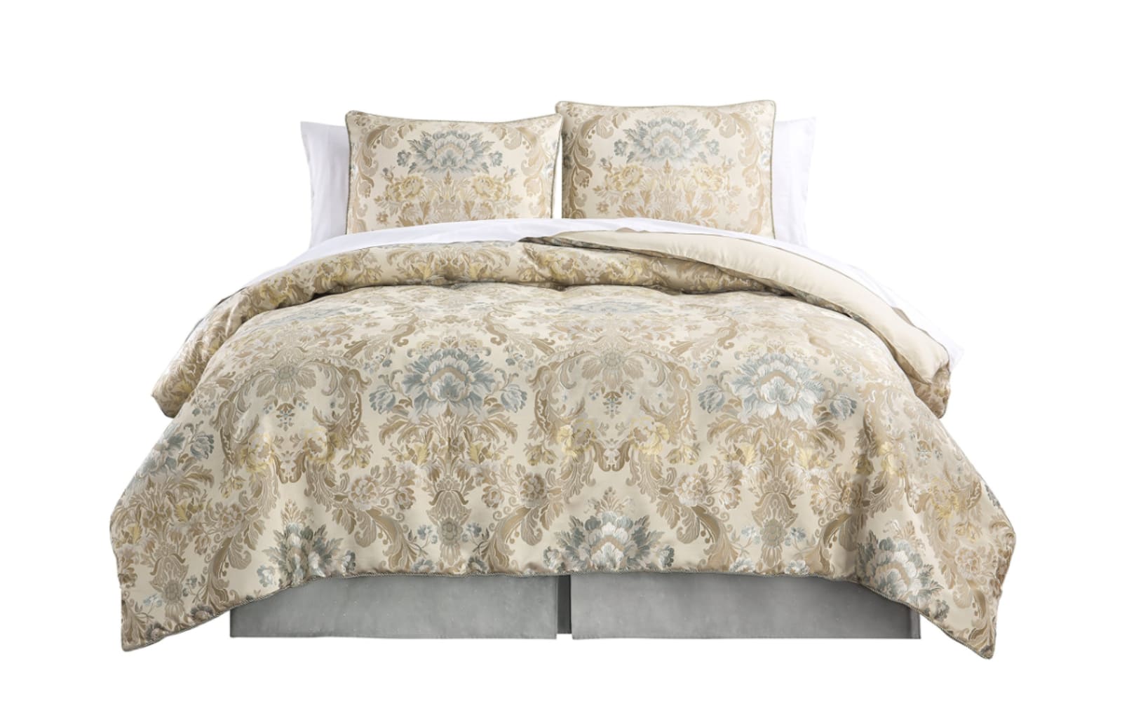 A classic damask jacquard comforter set with rich gold, beige, and blue tones that brings regal elegance and cohesive coordination to your bedroom.
